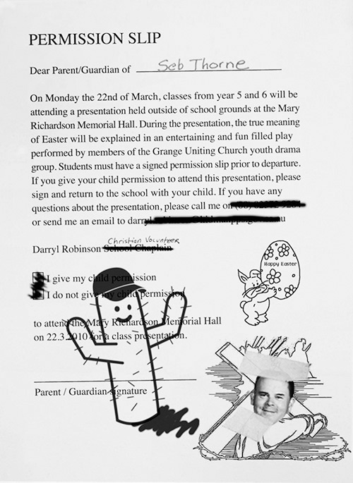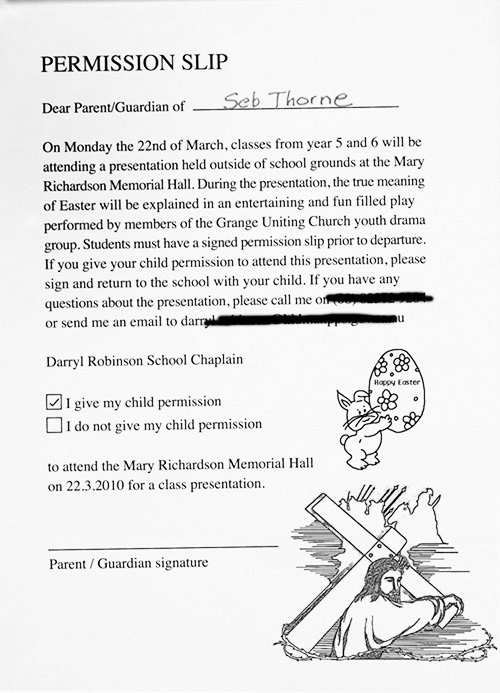 I have received your permission slip featuring what I can only assume is a levitating rabbit about to drop an egg on Jesus.