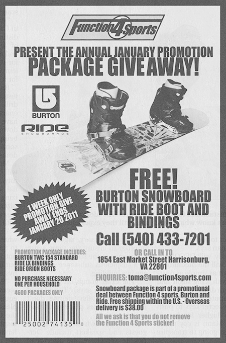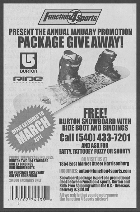 I was sent the attached advertisement from a friend who follows you on twitter. If this was some kind of joke I fail to see the humor. We had over 500 calls asking for free snowboards and I know your responsible.