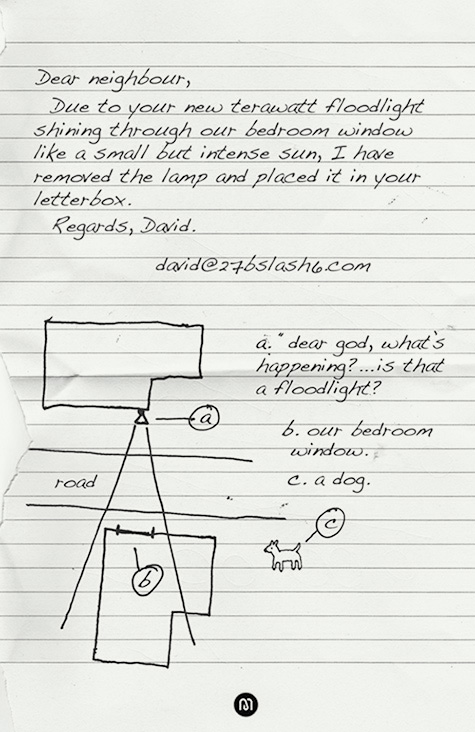 Thank you for your email. While I accept that curtains are usually the key to community accord, in this instance they would need to be constructed of eight-inch-thick lead sheeting. Last night, with my curtains closed and bedside light off, I read a book. Wearing sunglasses. Under a blanket.