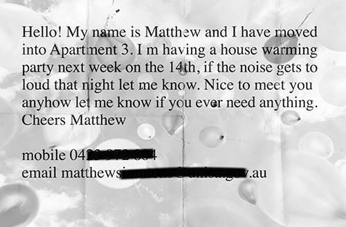 A few weeks ago, a guy moved into the apartment across from me. I know little about him apart from the fact that he owns cane furniture as I saw him carrying it in. Last week, when I checked my mailbox, I found that my new neighbour had left me a note stating he is having a party and to let him know if the noise is too loud.